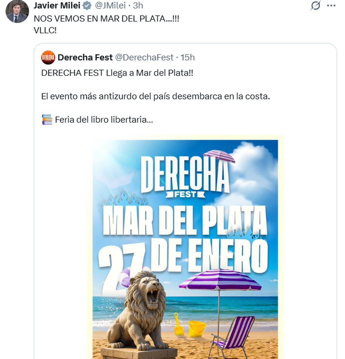 Entre actividades institucionales y otras de índole personal (y un poco de campaña, ya pensando en 2027), Javier Milei se pasará los últimos 15 días de enero arriba de un avión. Este jueves (15/01) confirmó su asistencia al "Derecha Fest" -el " evento más antizurdo"- en Mar del Plata.