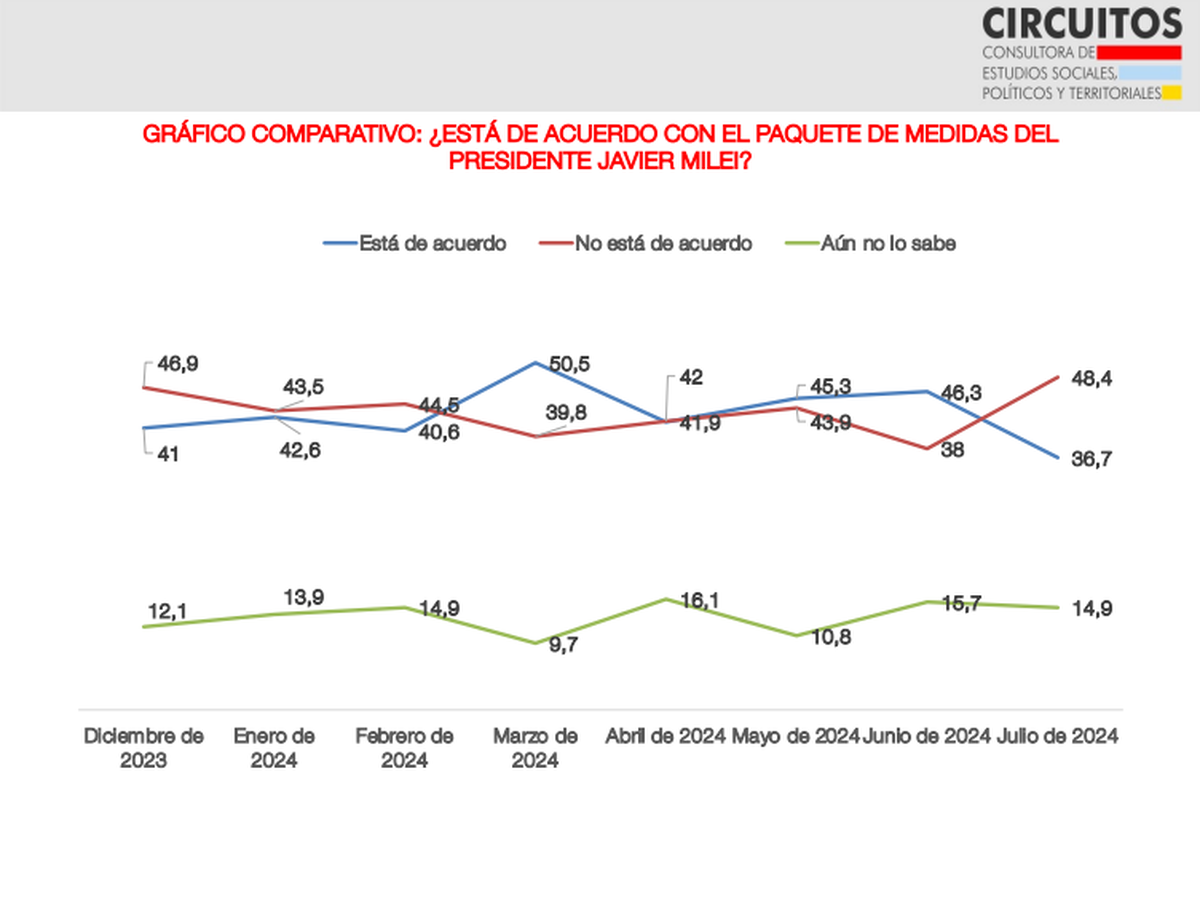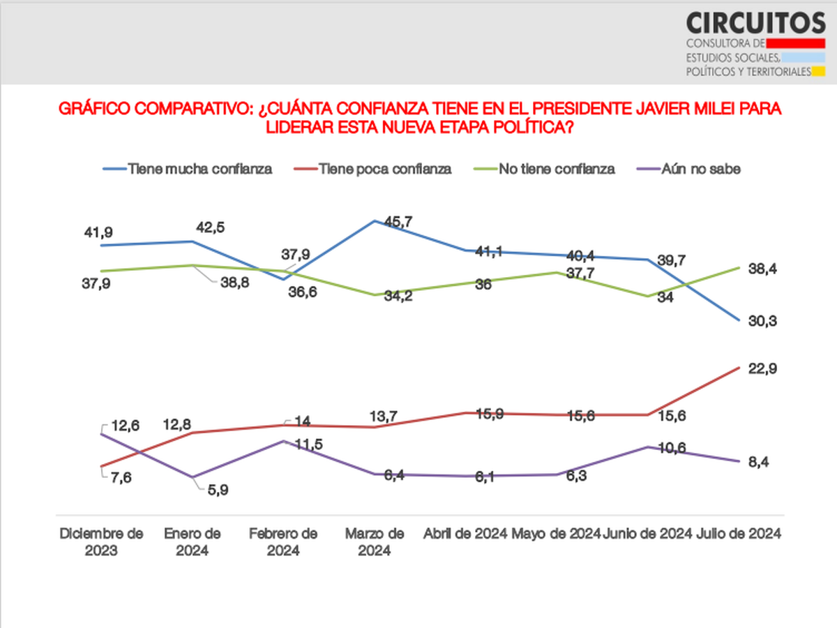 El resultado es producto de una casi constante erosión -sin piso aún- en la aprobación del Presidente desde el pico de 50 puntos que la serie histórica de Circuitos ubicó en marzo último. Sin embargo, la caída entre junio y julio supera a la que se pudo registrar entre meses anteriores.