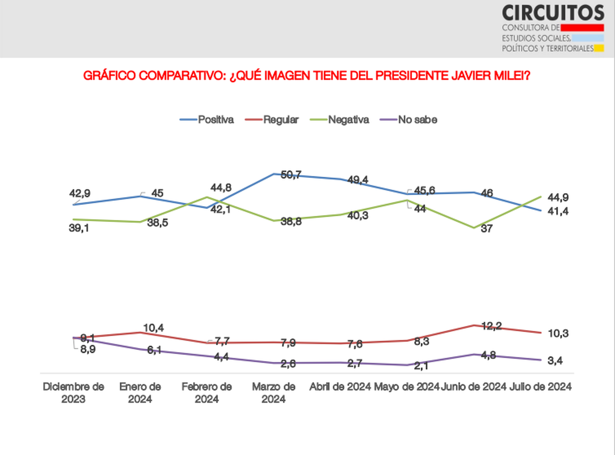 Entre los aspectos sobre los que la encuesta indaga, aparece la imagen del Presidente. En julio, la positiva se ubicó en el 41,4%, casi 5 puntos menos que en la medición anterior.