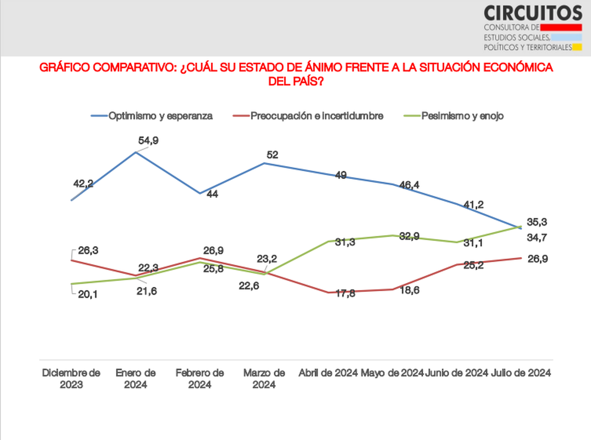 La última encuesta nacional de la consultora Circuitos expuso que en julio hubo un fuerte deterioro y un cambio de tendencia en indicadores que hasta el mes anterior habían sido favorables para Javier Milei.