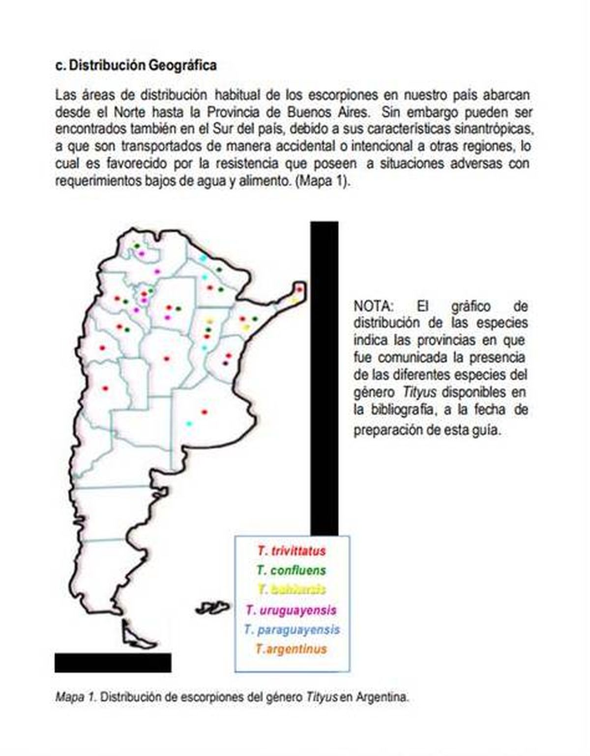 En cuanto a la distribución geográfica de los alacranes/escorpiones, los mismos se encuentran en un área que comprende desde el Norte de la Argentina hasta provincia de Buenos Aires, pese a que algunos especímenes aislados accidentalmente pueden ser trasladados hacia el sur del país.