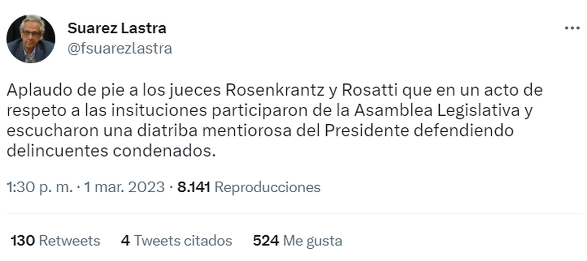 “Lamentablemente, el Poder Judicial hace tiempo que no cuenta con la confianza pública, no funciona eficazmente y no se muestra con la independencia requerida frente a los poderes fácticos y políticos”, disparó con el aplauso de algunos presentes.