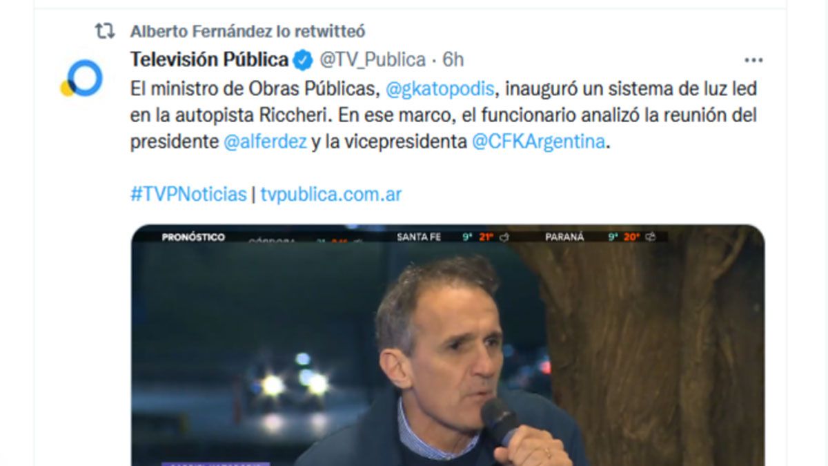 Alberto Fernández compartió en Twitter un video del ministro de Obras Públicas, Gabriel Katopodis, quien durante un acto analizó el encuentro entre el mandatario y la vicepresidenta.