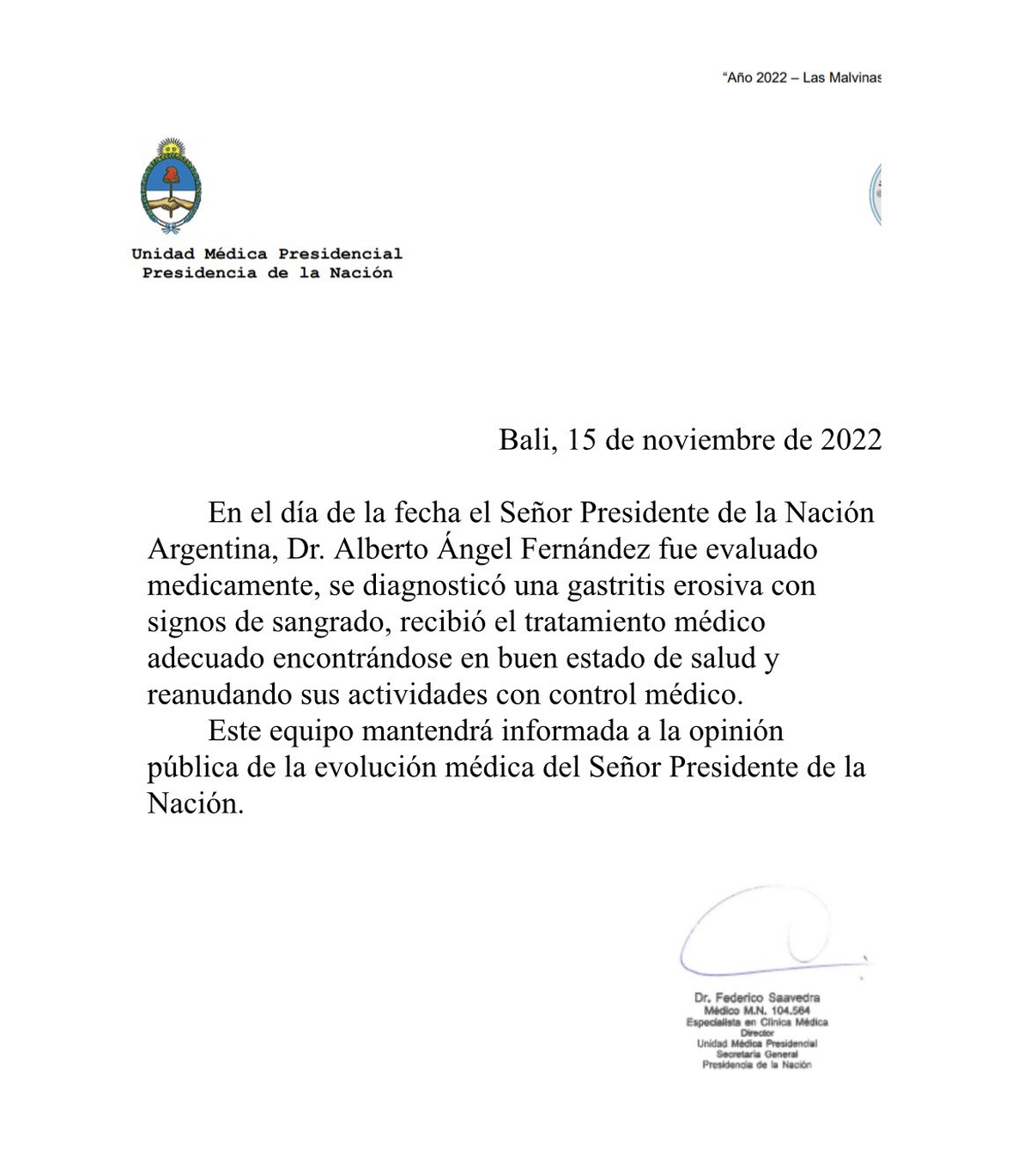 El presidente Alberto Fernández sufre "gastritis erosiva con signos de sangrado". Así lo confirmaron fuentes periodísticas que acompaña a la comitiva luego de un escueto comunicado de la Unidad Médica Presidencial. Al parecer, la descompensación que sufrió en Bali (Indonesia) previo a su participación en actividades del G20 y una reunión bilateral con su par chino, Xi Jinping, fue importante: