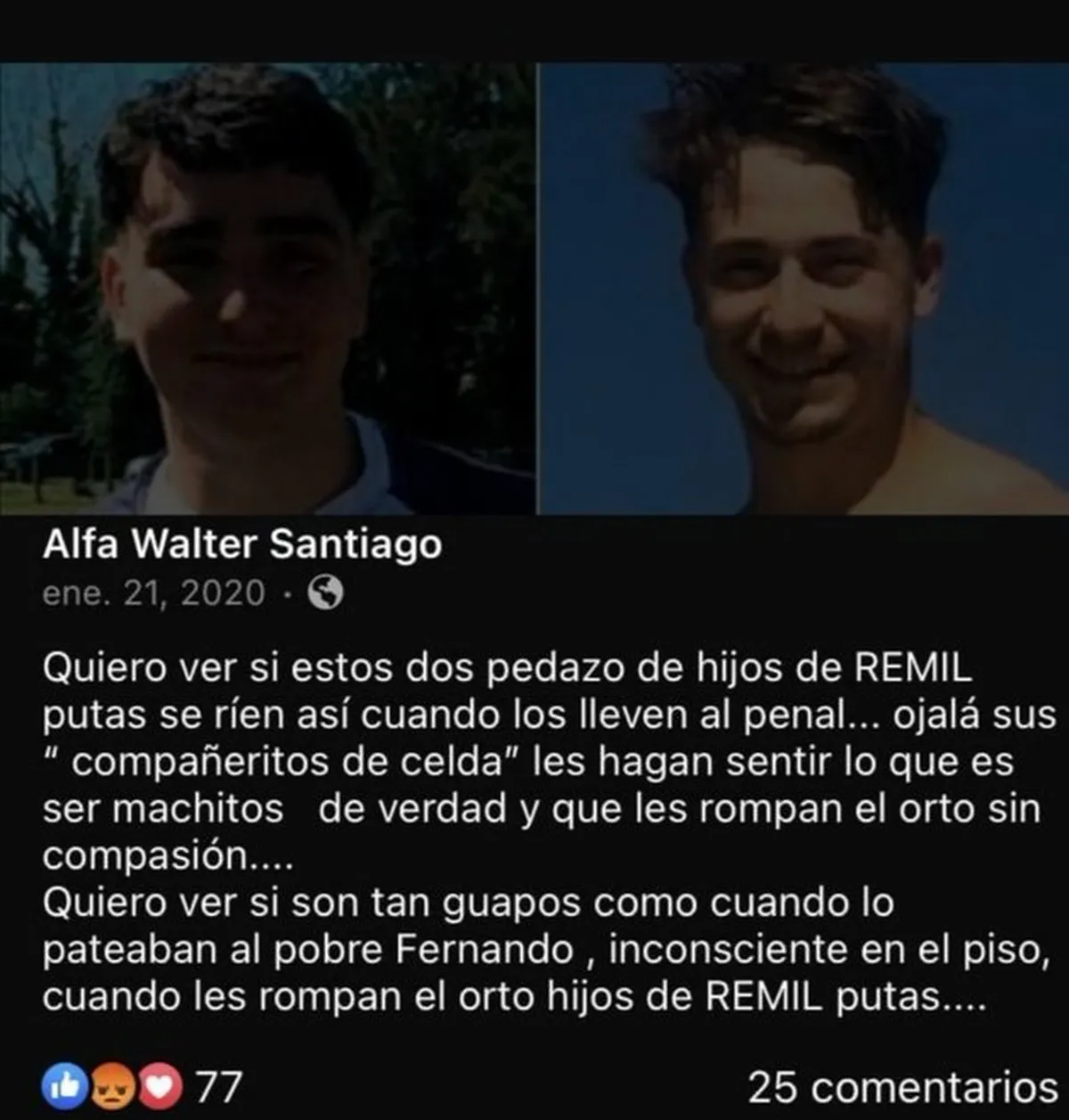 Aunque las palabras de Walter Santiago alias Alfa fueron muy cuestionadas por los internautas, el sexagenario y actual participante de GH había sido letal con respecto a la patota asesina, tal como lo reflejó en su posteo de enero del 2020.