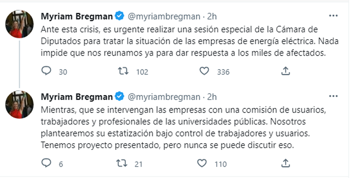 "Ante esta crisis, es urgente realizar una sesión especial de la Cámara de Diputados para tratar la situación de las empresas de energía eléctrica. Nada impide que nos reunamos ya para dar respuesta a los miles de afectados."