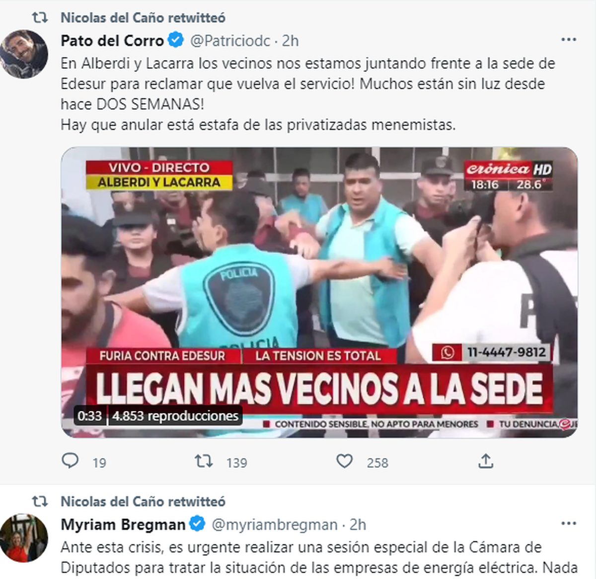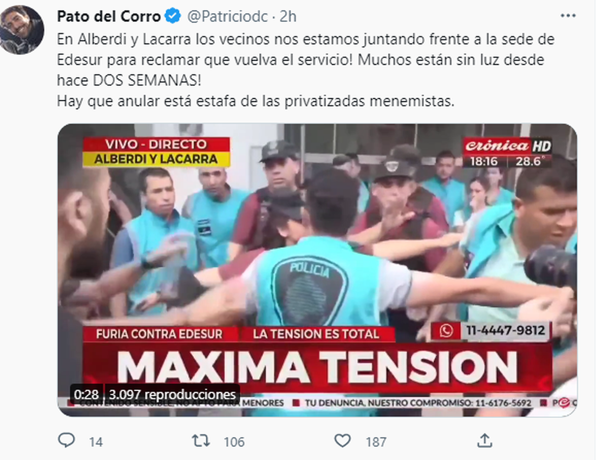 "En Alberdi y Lacarra los vecinos nos estamos juntando frente a la sede de Edesur para reclamar que vuelva el servicio! Muchos están sin luz desde hace DOS SEMANAS! Hay que anular está estafa de las privatizadas menemistas."