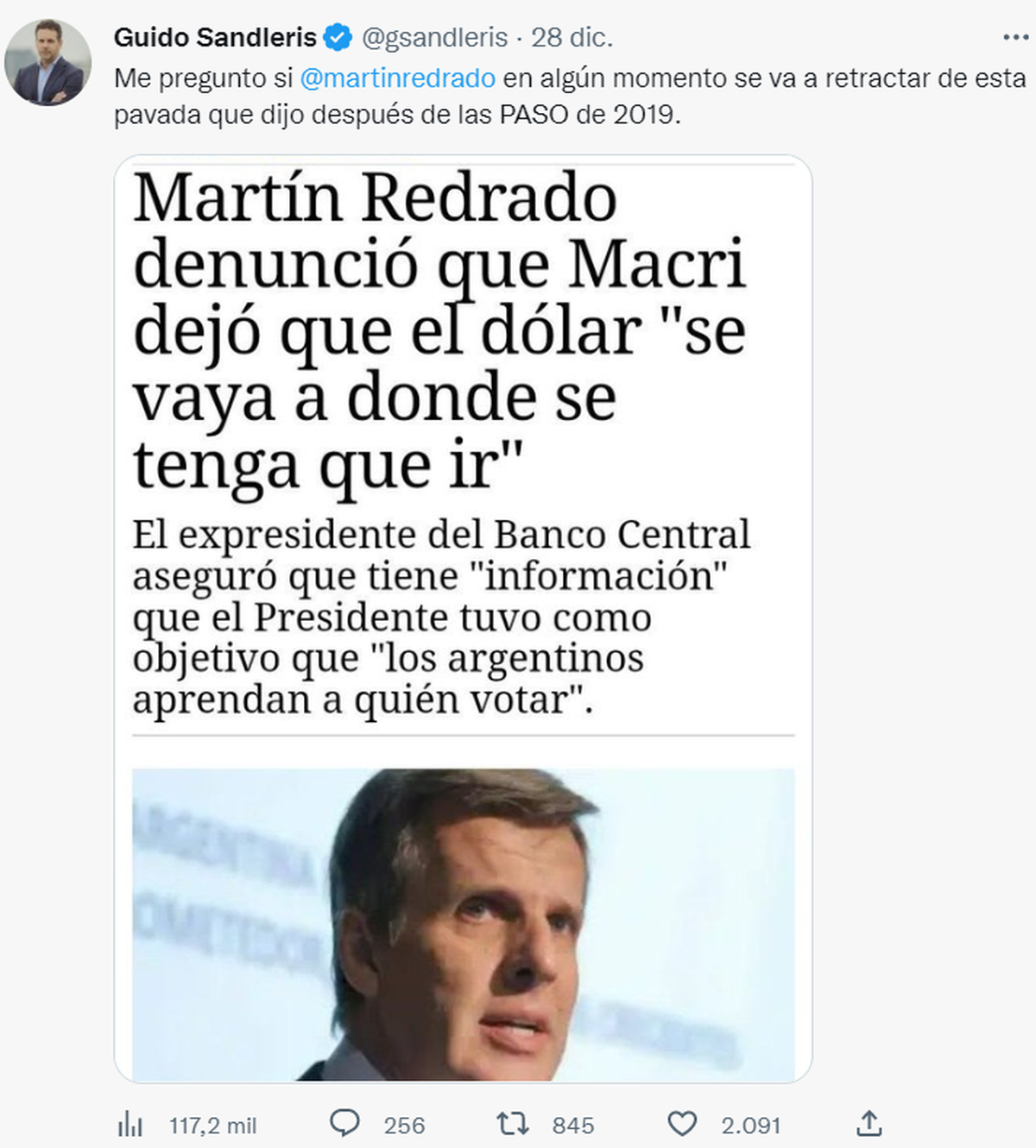 El primero que salió a criticarlo fue el expresidente del BCRA durante la última etapa de Mauricio Macri, Guido Sandleris, quien todavía cree que es palabra autorizada para opinar de macroeconomía.