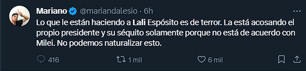 "Lo que le están haciendo a Lali Espósito es de terror. La está acosando el propio presidente y su séquito solamente porque no está de acuerdo con Milei. No podemos naturalizar esto."