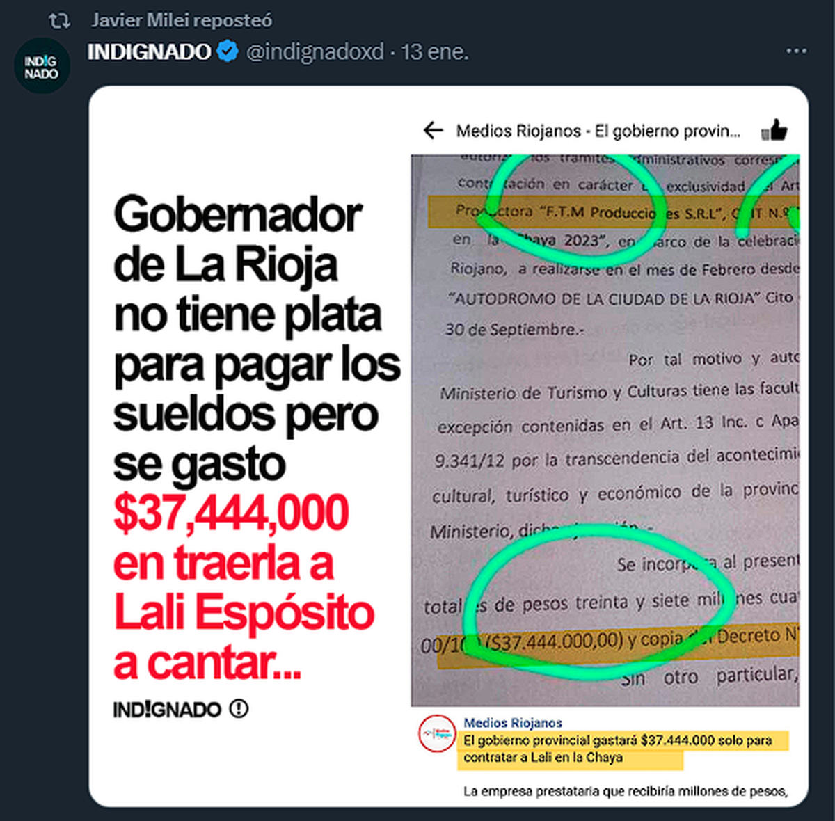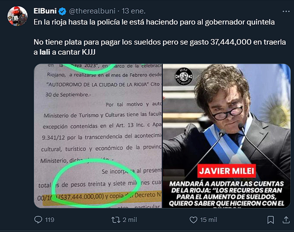 "En La Rioja hasta la policía le está haciendo paro al gobernador Quintela no tiene plata para pagar los sueldos, pero se gastó 37,444,000 en traerla a Lali a cantar KJJJ".