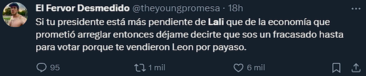 "Si tu presidente está más pendiente de Lali que de la economía que prometió arreglar, entonces déjame decirte que sos un fracasado hasta para votar porque te vendieron Leon por payaso."