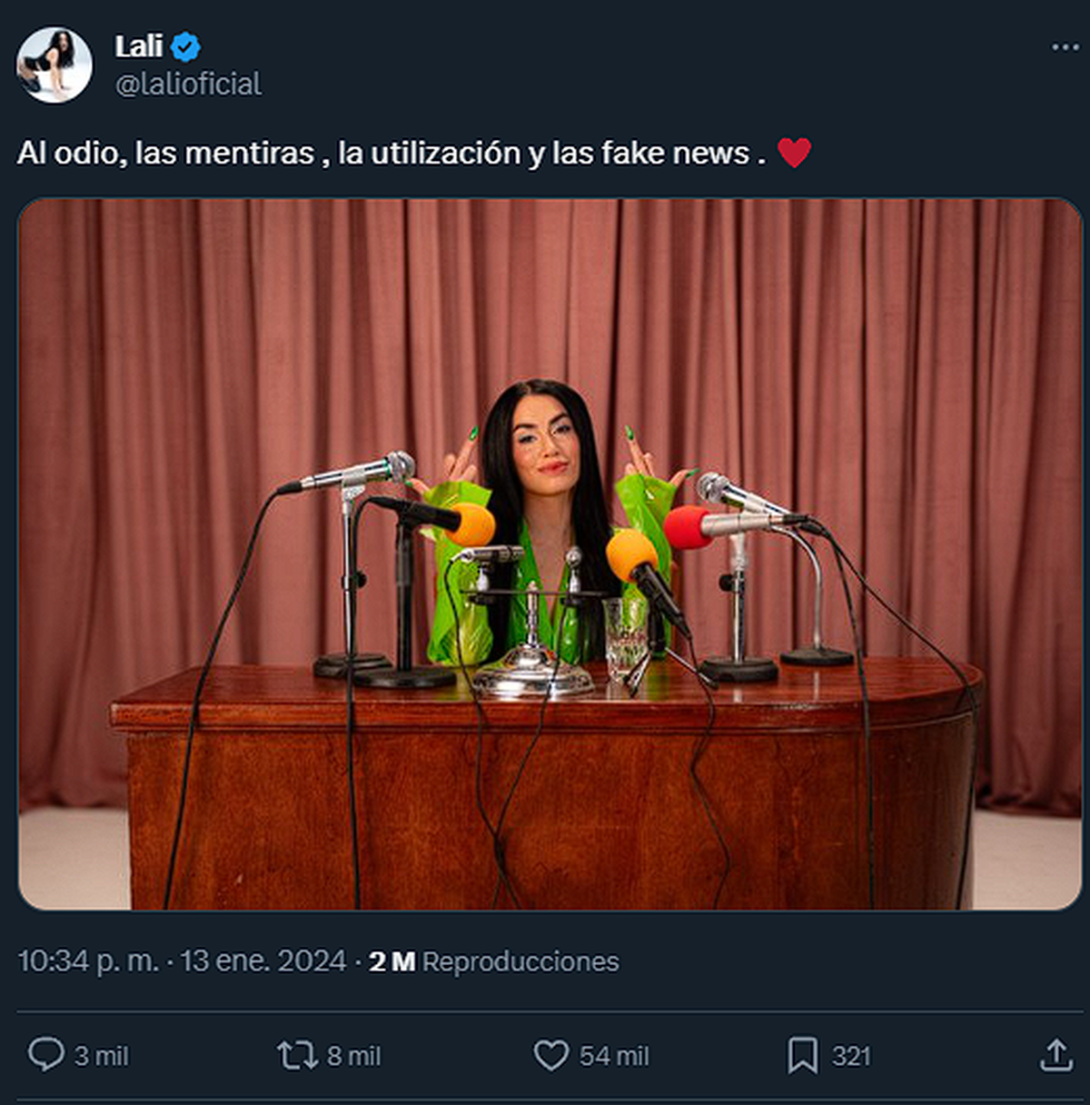 Si bien la imagen de abajo, la captura de la cuenta oficial de Lali en Twitter/X, fue pública el 13 de enero, un día previo a las declaraciones del presidente, lo cierto es que ahí ya se deja ver la opinión de la artística con el panorama actual. Por lo que fue una de las imágenes (por cibernautas) más usadas al momento de publicar contenido relacionado con ella.