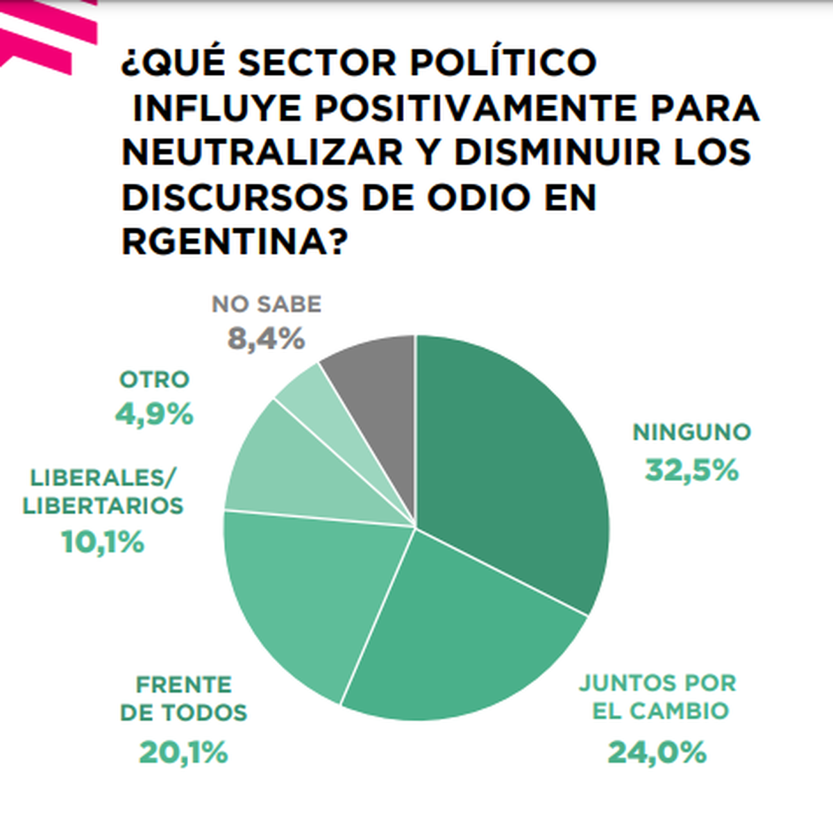 Por eso, cuando se le pregunta en el estudio a la opinión pública qué sector influye positivamente para neutralizar y disminuirlos discursos de odio, la primera opción en aparecer es “ninguno” con un 32%.