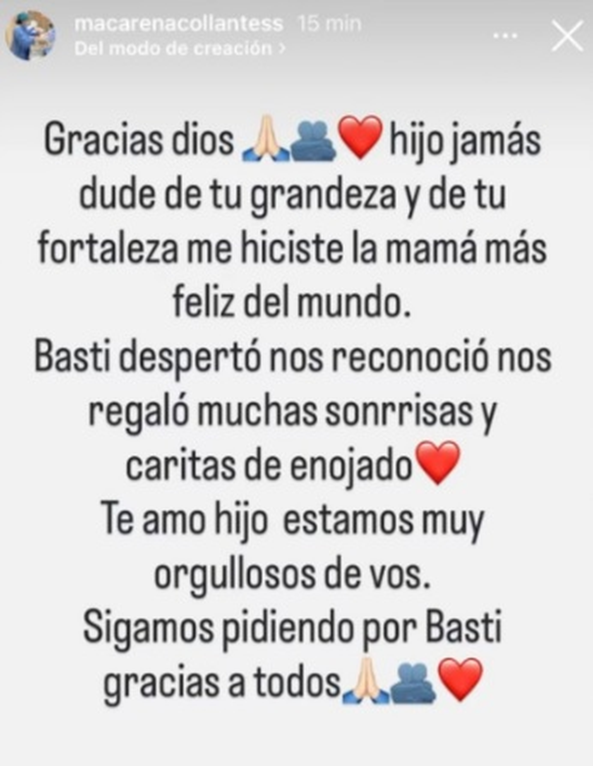 La madre del niño, Macarena Collantes, informó que Bastian reconoció a quienes lo estaban acompañando: el último parte médico del Ministerio de Salud bonaerense anunciaba la esperada mejoría.