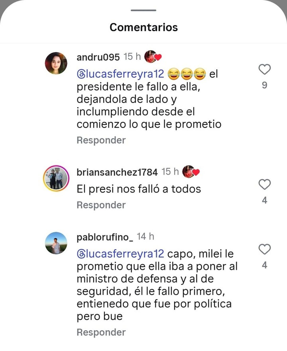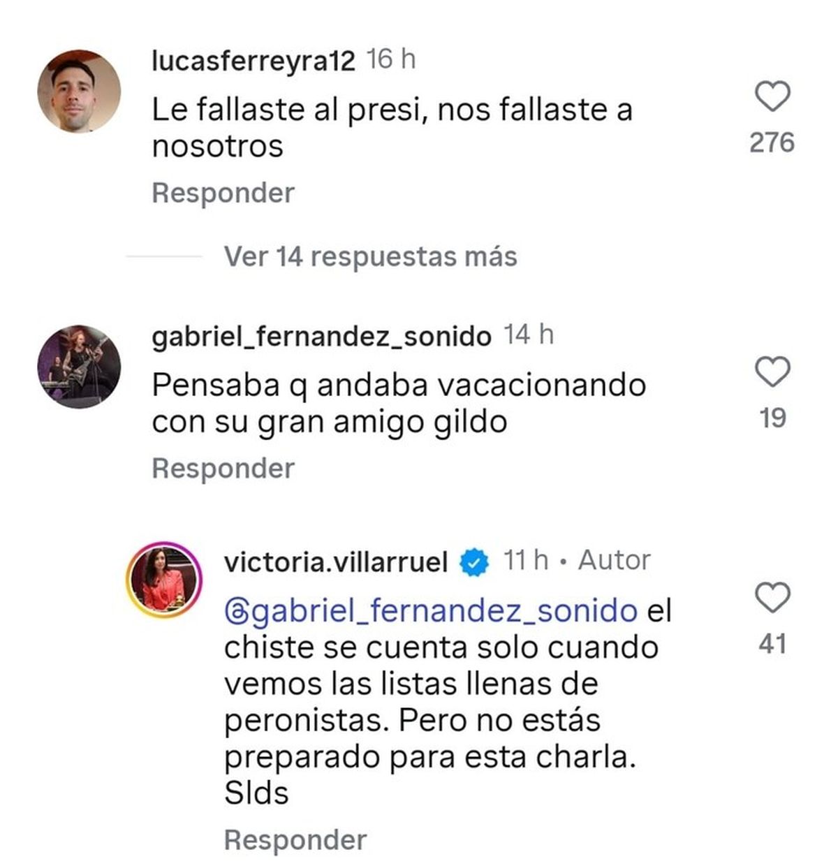 A lo largo de esas respuestas, Villarruel reaccionó con varios "Me Gusta" a usuarios que la defendieron y a otros que criticaron a Milei.