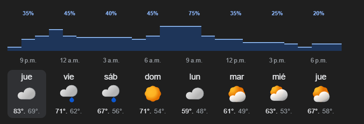 Según el modelo ECMWF, las tormentas eléctricas serían más probables desde la madrugada hasta el mediodía del viernes, seguidas de lluvias débiles y un nuevo período de inestabilidad hacia la tarde. El sábado, la probabilidad de tormentas se concentrará en las primeras horas de la mañana, con temperaturas entre 17° y 21°.