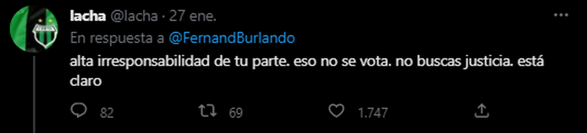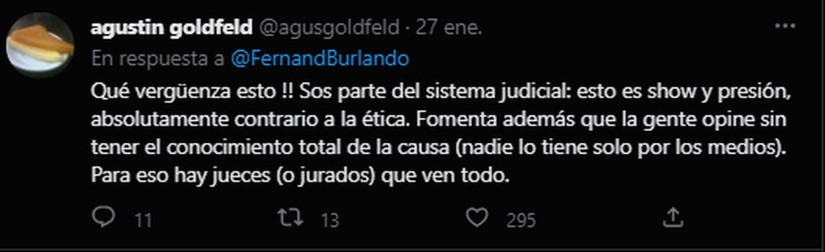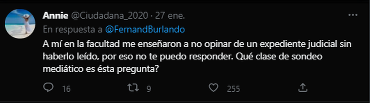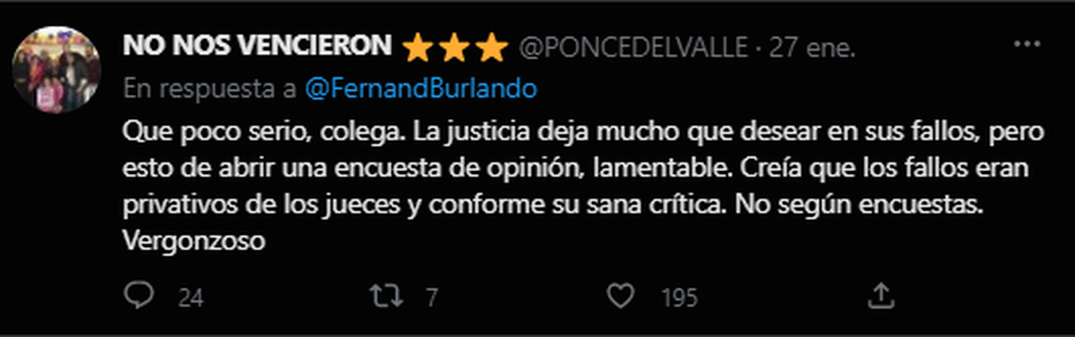 Gran parte de las respuestas fueron negativas, considerando que Burlando está usando el juicio de manera mediática y poco ética en la medida que se espera una respuesta. O por lo menos así lo hicieron gran parte de las respuestas al tuit de la encuesta.