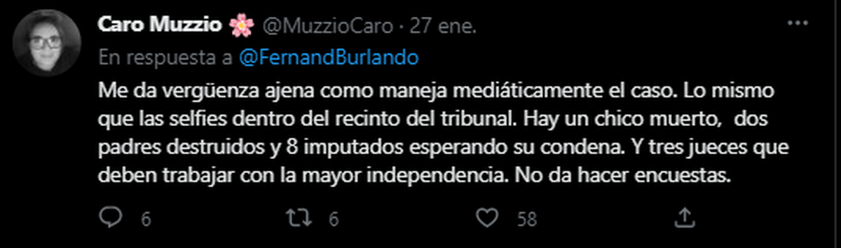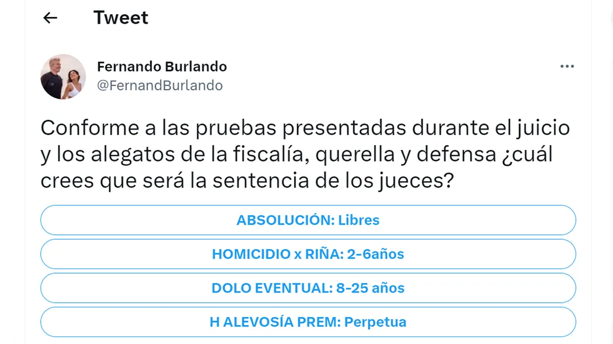 A rasgos generalizados: el 58 % respondió “perpetua con alevosía y premeditación”, la pena que, Burlando, junto al resto de los fiscales, solicitó para los 8 rugbiers imputados en el asesinato de Fernando Báez Sosa. El 31 % contestó “Dolo Eventual: de 8 a 25 años”; el 8 % eligió “homicidio por riña: de 2 a 6 años” y el 1 % opinó que los 8 rugbiers quedarán en libertad.
