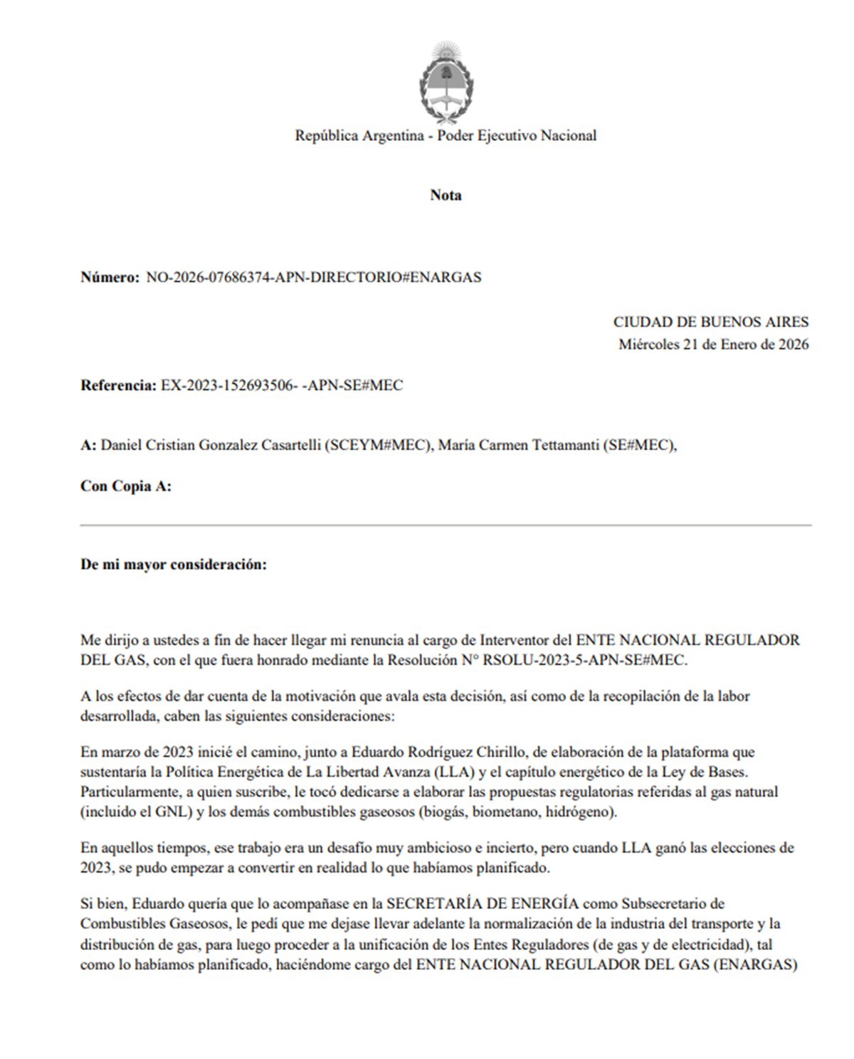 Casares explicó: “entiendo que no he satisfecho vuestras expectativas y/o no cuento ya con vuestra confianza para continuar colaborando. No cabe otra decisión que presentar mi renuncia indeclinable al cargo de Interventor del ENARGAS”.