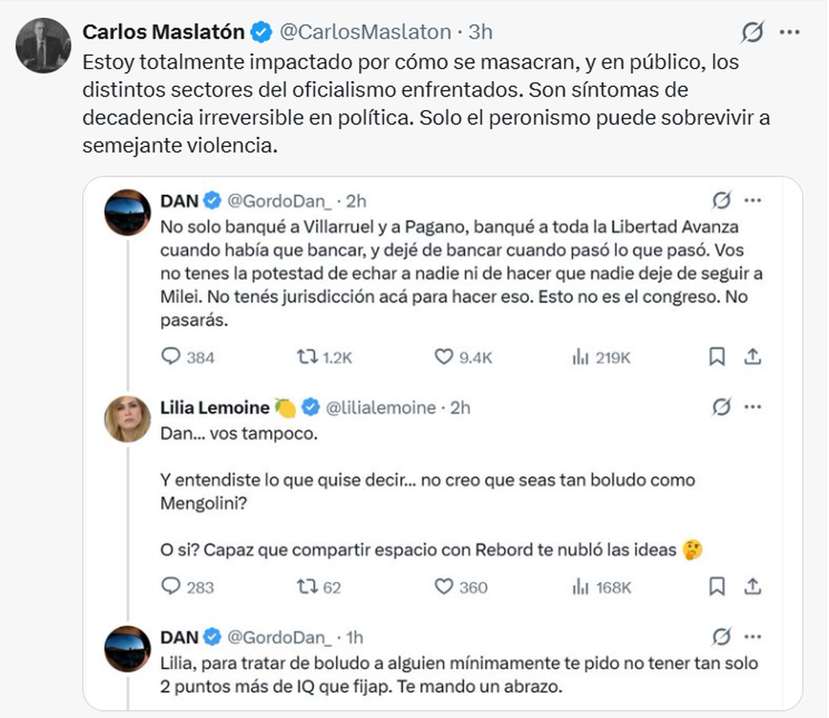 Sus palabras cobran relevancia en el contexto de la interna libertaria feroz que se desató en las últimas horas, y que este viernes (17/04) incluyó un fuerte cruce entre Lilia Lemoine y Daniel Parisini (Gordo Dan).