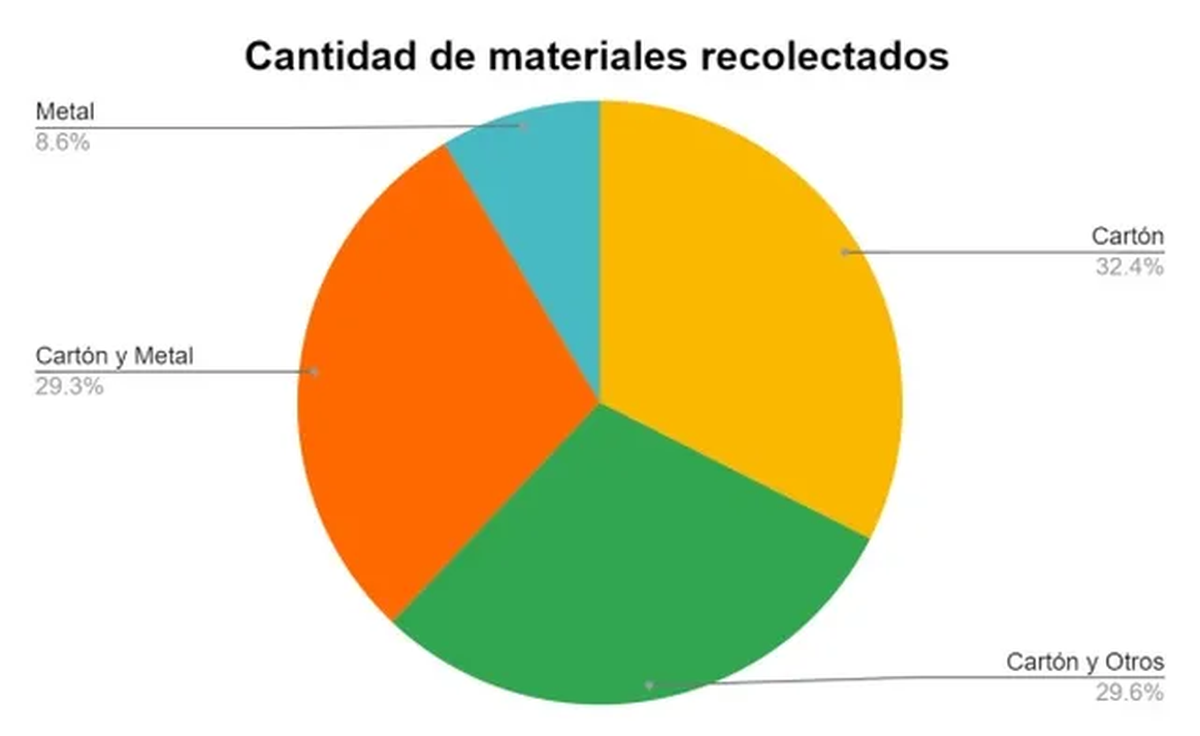 En cuanto a los materiales recolectados, el municipio relevó que: el 29.3% recolecta cartón y metal simultáneamente; el 32.4% vende papel y cartón con exclusividad; y el 29.6% recolecta cartón y otros (vidrio y plástico). "Estas diferencias tienen que ver tanto con la rentabilidad de estos materiales, como con la disponibilidad de las herramientas de trabajo. Es más fácil transportar y acomodar cartón y papel que plásticos preformados dentro de una carreta", aclaran en el informe.