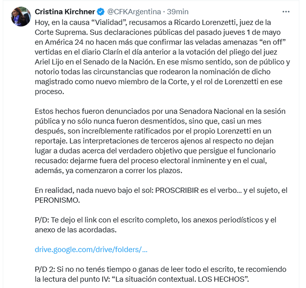 "Sus declaraciones públicas del pasado jueves 1 de mayo en América 24 no hacen más que confirmar las veladas amenazas 'en off' vertidas en el diario Clarín el día anterior a la votación del pliego del juez Ariel Lijo en el Senado de la Nación. En ese mismo sentido, son de público y notorio todas las circunstancias que rodearon la nominación de dicho magistrado como nuevo miembro de la Corte, y el rol de Lorenzetti en ese proceso", argumentó CFK al anunciar la recusación contra Ricardo Lorenzetti.