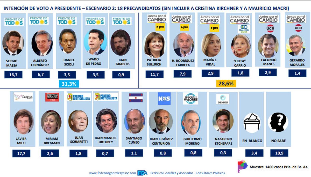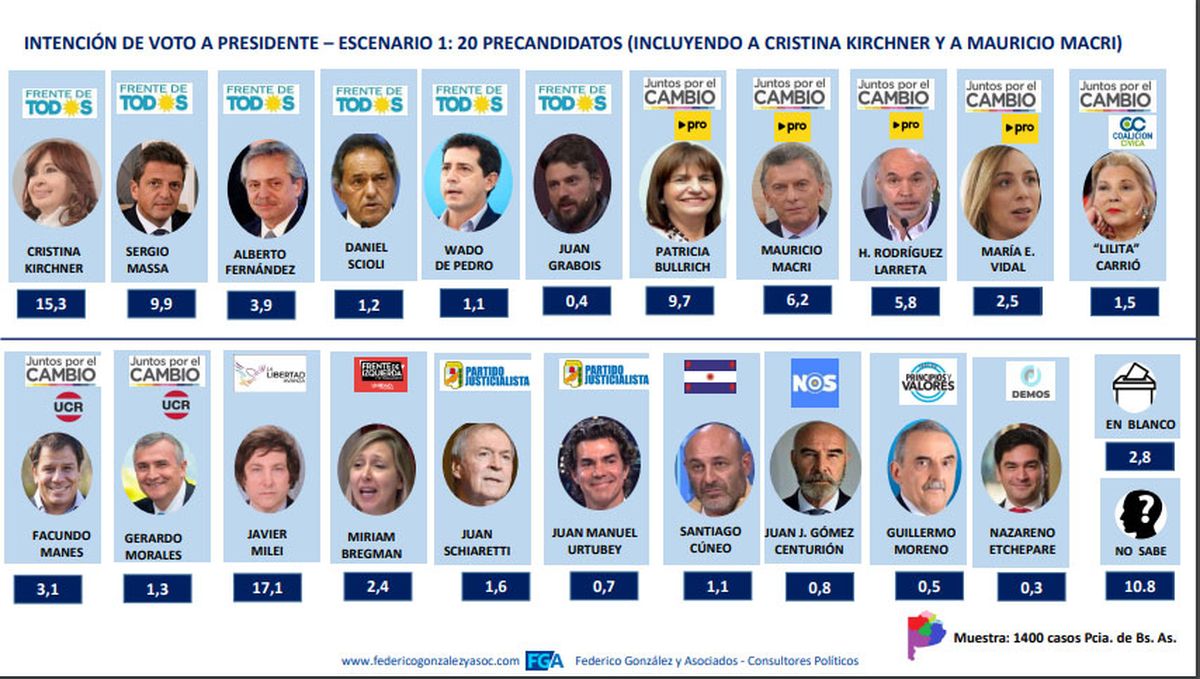 La encuesta de González en el principal distrito electoral ofrece 2 escenarios: uno con CFK y Mauricio Macri; y otro sin los exPresidentes.