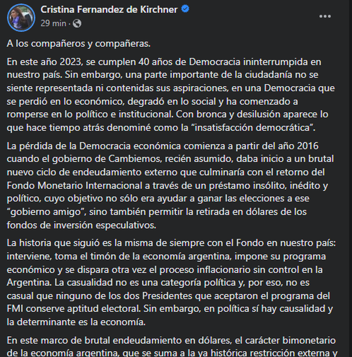 En la carta de Cristina Fernández, que publicó en todas sus redes sociales, se leyó lo siguiente: