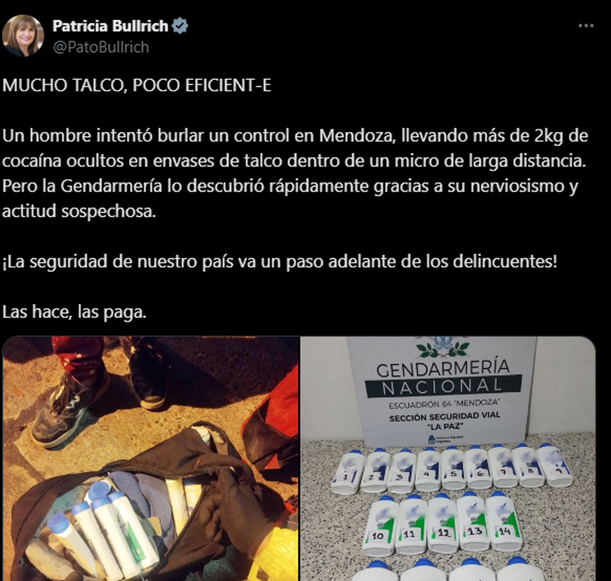 La detención del hombre llegó a Patricia Bullrich que la difundió en sus redes sociales personales ironizando sobre la actitud del detenido y la presunta metodología de tráfico: “Mucho talco, poco Eficient-e”, arrancó su posteo la funcionaria y agregó: “Un hombre intentó burlar un control en Mendoza, llevando más de 2kg de cocaína ocultos en envases de talco dentro de un micro de larga distancia. Pero la Gendarmería lo descubrió rápidamente gracias a su nerviosismo y actitud sospechosa”.