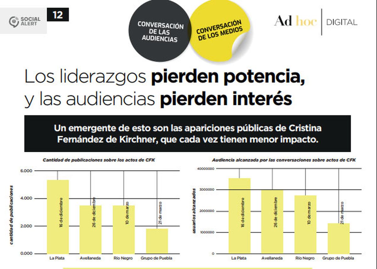 El informe, relevado a través de herramientas como Social Alert y Google Trends, toma el de la Vicepresidente como caso testigo de la pérdida de "potencia" de los liderazgos y de "interés". "Un emergente de esto son las apariciones públicas de Cristina Fernández de Kirchner, que cada vez tienen menor impacto", sostiene el documento. Cabe recordar que la exPresidente ha hecho de las redes sociales su principal herramienta de comunicación, no sólo para emitir comentarios sino también para transmitir sus apariciones.
