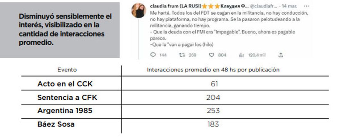 Por último, el estudio analiza las interacciones en un período de 48 horas. Las que ocurrieron durante el acto en el CCK fueron varias veces menor que las que surgieron de la lectura de la sentencia contra Cristina Kirchner, ocurrida en diciembre. También lo fueron en relación a las conversaciones sobre la película 'Argentina 1985' y del caso del asesinato de Fernando Báez Sosa.