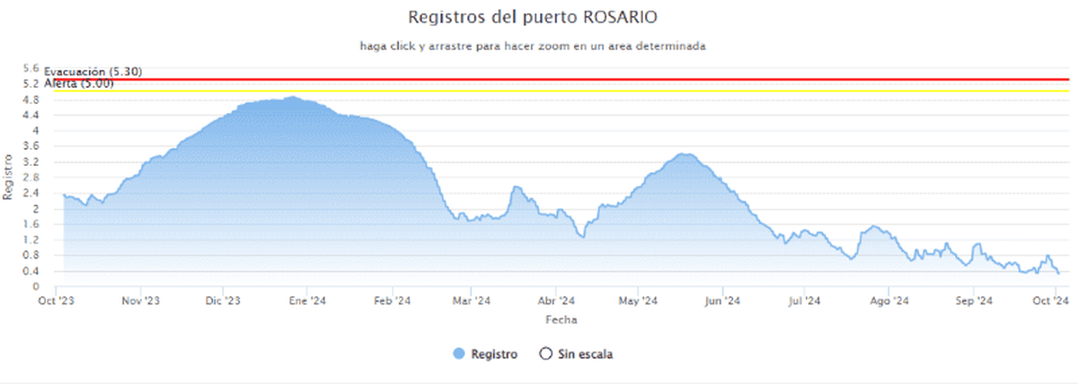 La comparación con años anteriores pone en evidencia el cambio en los niveles del Paraná. A principios de octubre de 2023, el nivel del río en Rosario era de 2,30 metros, casi dos metros por encima de la altura actual.
