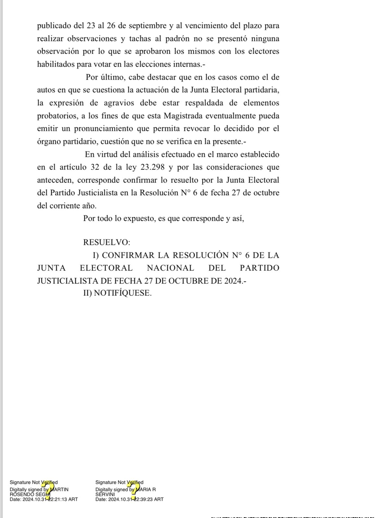 Antes, con el rechazo de la Junta, Quintela acudió al juzgado electoral a cargo de María Servini, y presentó una apelación a la resolución de la Junta Electoral que no oficializó su lista y pidió la suspensión de los comicios partidarios al denunciar un “accionar parcializado” de la Junta Electoral, “manifiesta violación de la cadena de custodia” de la documentación y la “imposibilidad de control y fiscalización” de los avales de la lista rival.
