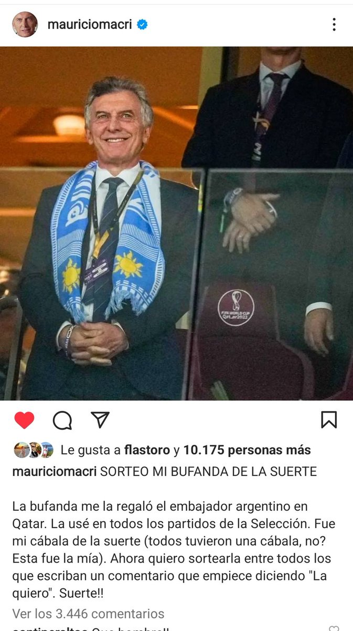 Hablando de Mauricio Macri, si algo faltaba a esta radiografía populista de la dirigencia política es el sorteo del expresidente Mauricio Macri, quien ahora cree que fue su bufanda la que trajo la Copa del Mundo: