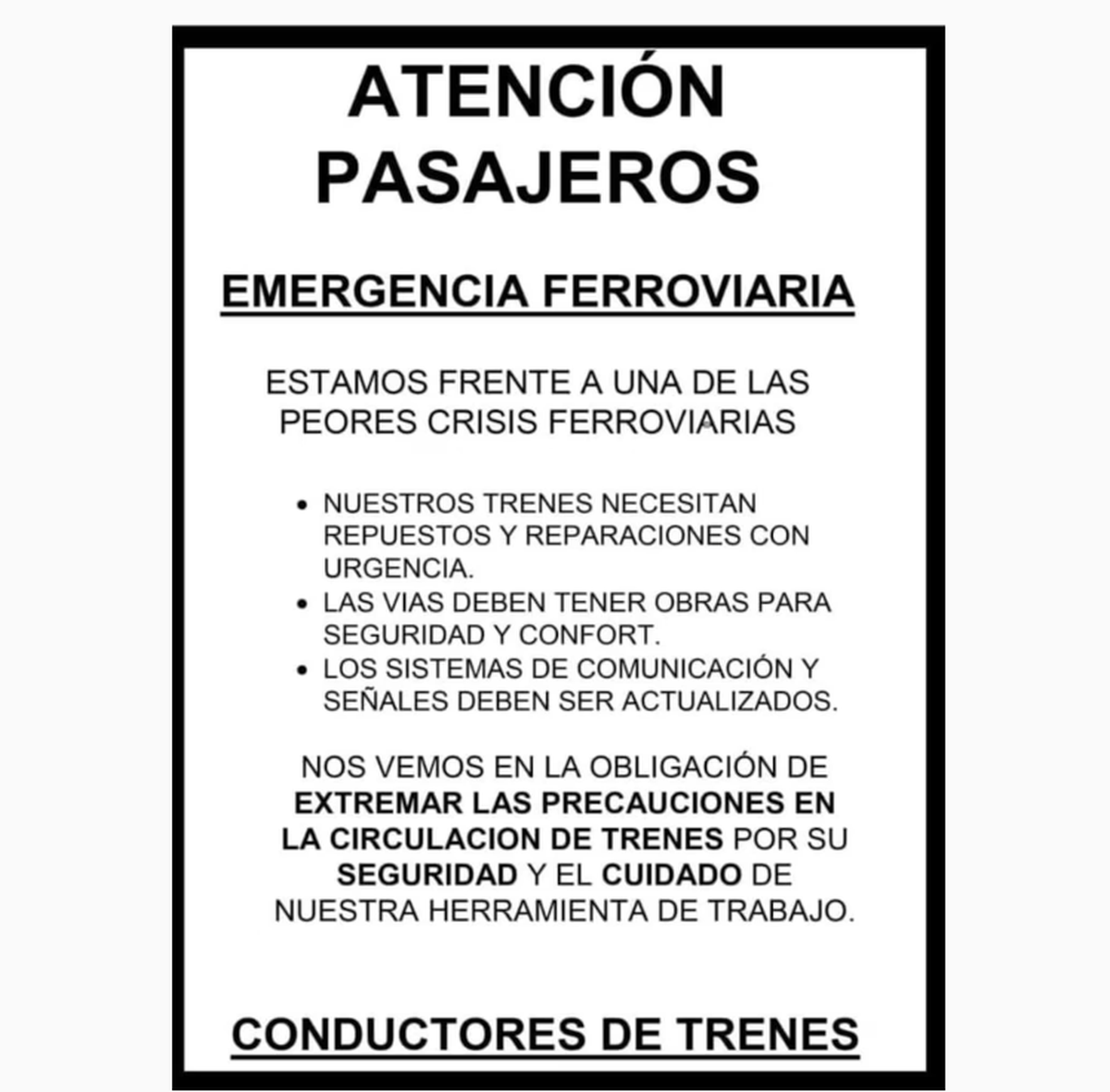 El gremio reclama por "repuestos y reparaciones para los trenes con urgencia", además, de "obras en las vías para seguridad y confort". También reclamaron la "actualización del sistema de comunicación y señales".