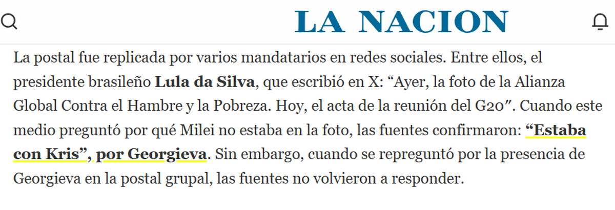 La explicación oficial para el 'faltazo' de Javier Milei a la foto de familia del G20 llegó en modo 'off the record', es decir, no hubo una declaración oficial y/o formal acerca de lo sucedido, sólo "fuentes del Gobierno" o "fuentes diplomáticas", sin nombre (¿para que no 'ruede ninguna cabeza'?). Y, en rigor, es una explicación carente de sustento: según La Nación y Clarín, explicaron que el Presidente argentino no asistió porque estaba reunido con la titular del FMI, Kristalina Georgieva.