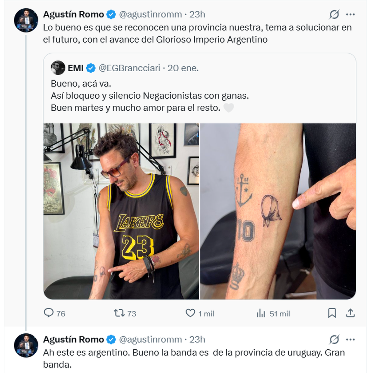 En rigor, Agustín Romo embistió contra Emiliano Brancciari, líder de la banda No Te Va Gustar, quien había publicado una foto de su nuevo tatuaje -una pañuelo de las Madres de Plaza de Mayo- acompañado por un mensaje contra el negacionismo. El diputado de LLA, al suponer que el músico era uruguayo, respondió con la controversial frase.