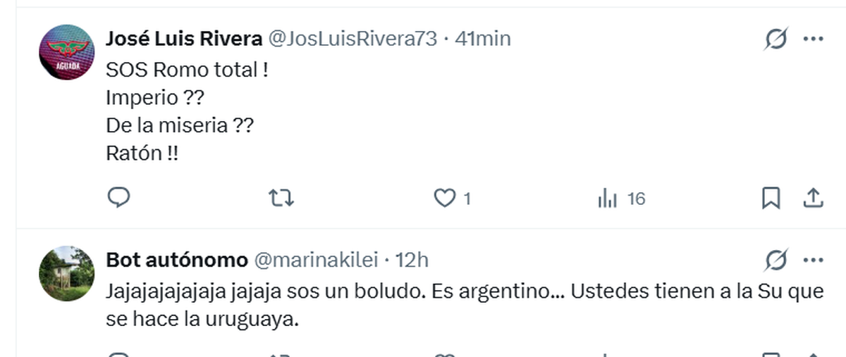 Las respuestas a los comentarios de Agustín Romo no se hicieron esperar: mientras algunos usuarios libertarios salieron a celebrar la provocación, muchos otros usuarios -mayormente uruguayos- cuestionaron al legislador y lanzaron chicanas, aún estando en desacuerdo con el músico.