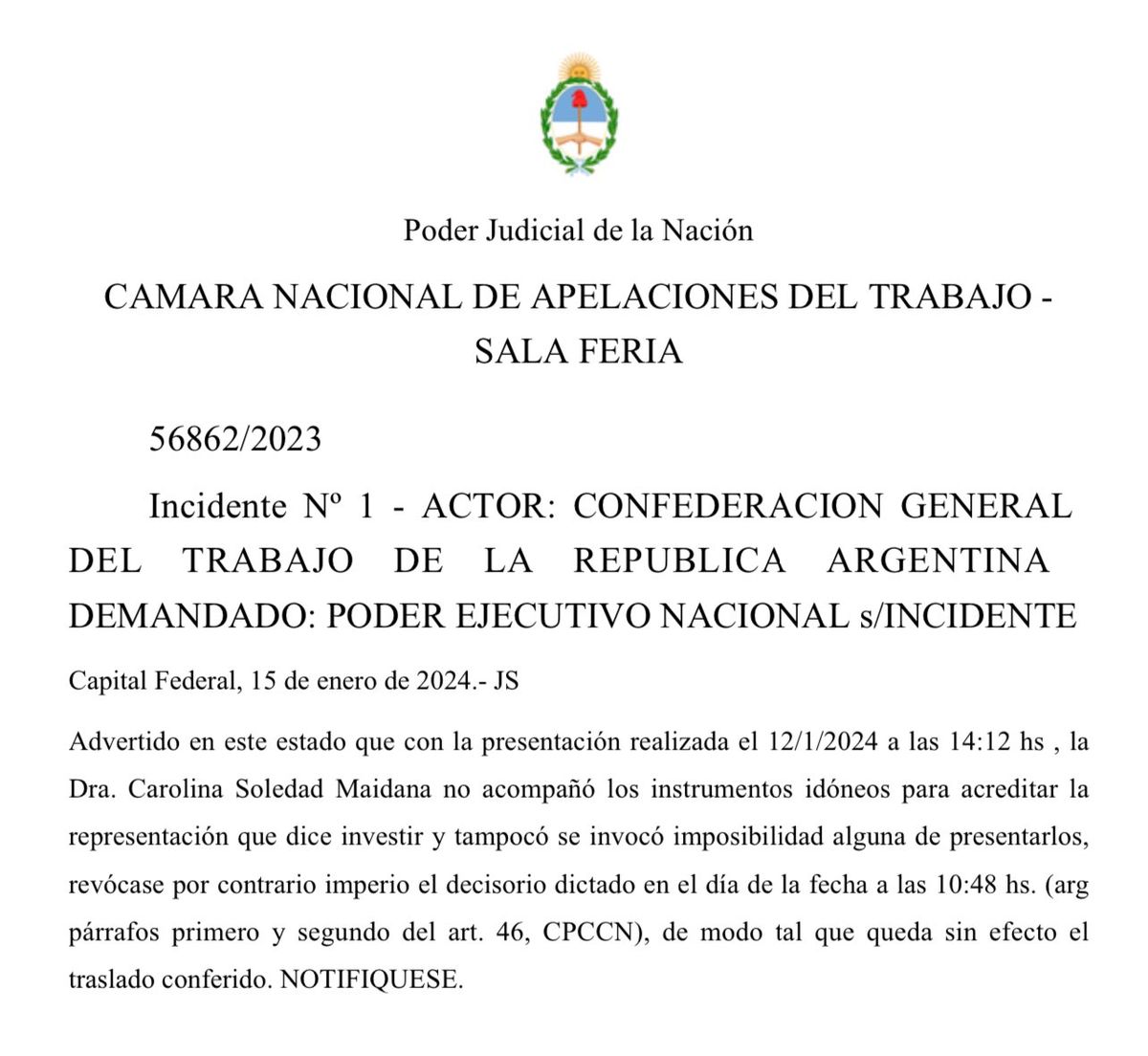 Nobleza obliga: siguiendo la traza del recurso del Ejecutivo Nacional, rechazado por la Cámara de Apelaciones del fuero del Trabajo por errores formales que, sin embargo, desacreditan cualquier presentación, Urgente24 ha confirmado que no fue la Procuración del Tesoro( Rodolfo Barra) la responsable del furcio. Fue Jefatura de Gabinete de Ministros de la Nación.