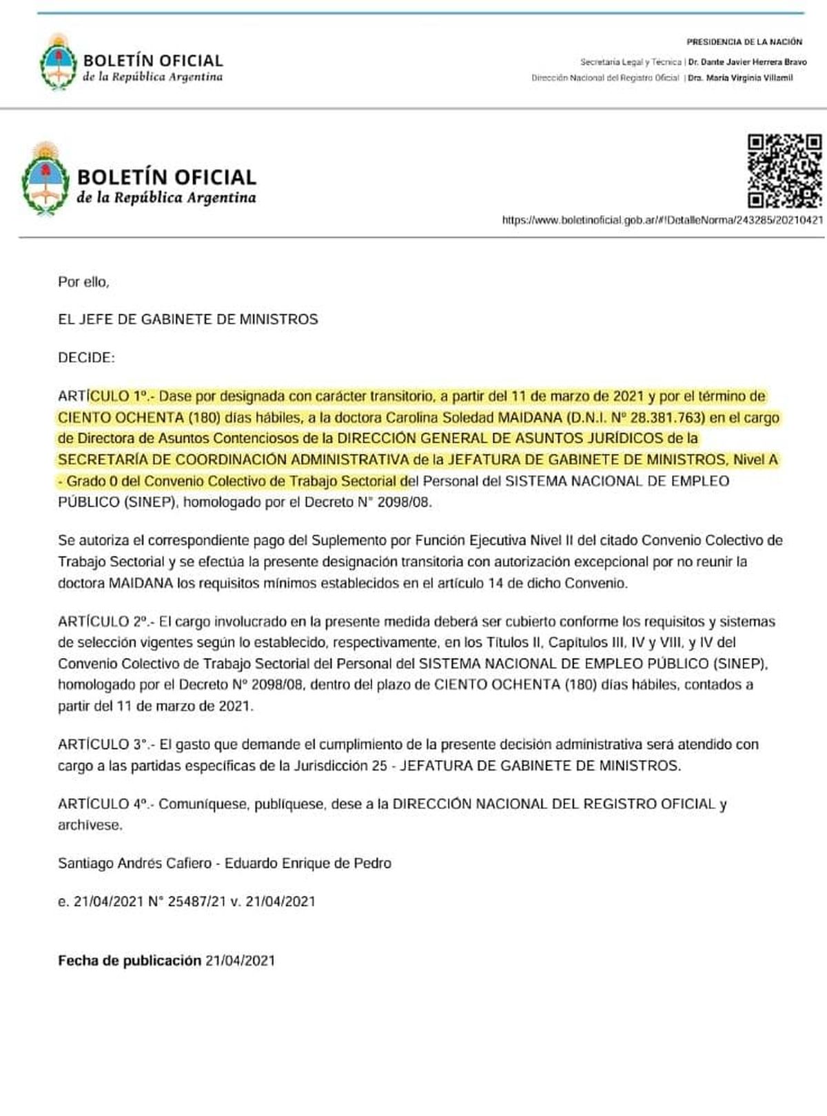 ¿Quién es Maidana? Es una abogada contratada por Jefatura de Gabinete de Ministros de la Nación en 2021, en días de Santiago Cafiero en esa repartición. Pruebas al canto:
