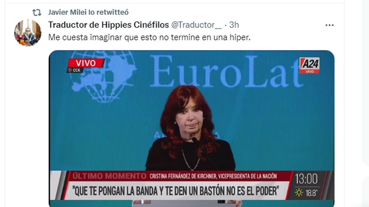 Pero también salieron al cruce los libertarios, como Ramiro Marra -que dijo que es un "Gobierno acabado"- y Javier Milei, quien retuiteó varios mensajes, además de José Luis Espert, quien calificó a Cristina Kirchner como un "ser maligno, despreciable".