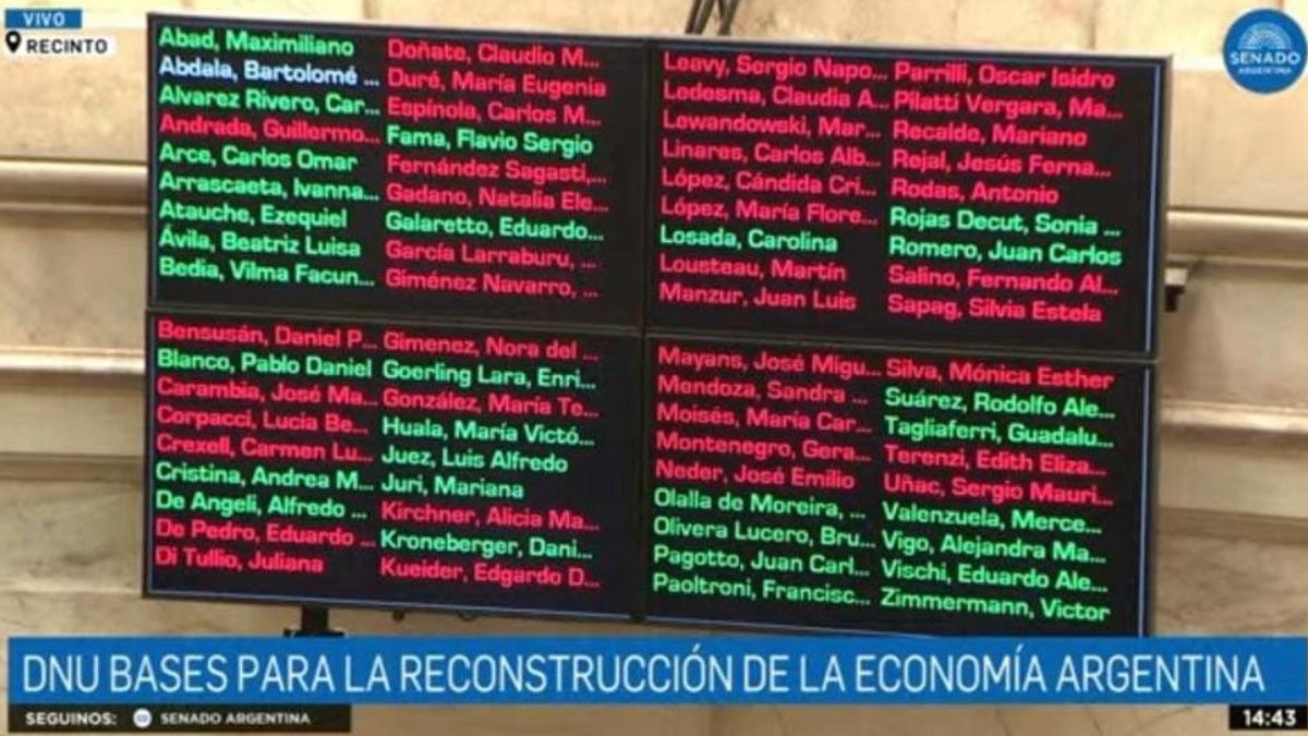 Con 42 votos negativos, 25 positivos, 4 abstenciones, el mega DNU de Javier Milei quedó formalmente rechazado por la Cámara de Senadores. En términos políticos, significa una derrota parlamentaria para el Gobierno de Javier Milei, quien ya le había advertido a Victoria Villarruel que ignore los pedidos del Senado y no se arriesgara al tratamiento del DNU.