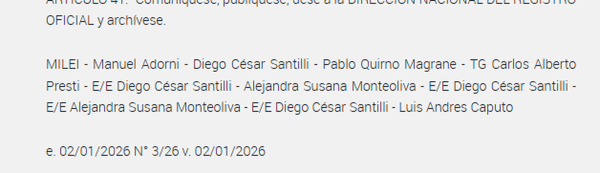 Es que a esta altura del año, la mayoría de los funcionarios del gabinete se encuentran ausentes por lo que fueron reemplazados en la firma por Santilli, que terminó firmando cuatro veces, y Monteoliva, que firmó dos veces la norma.