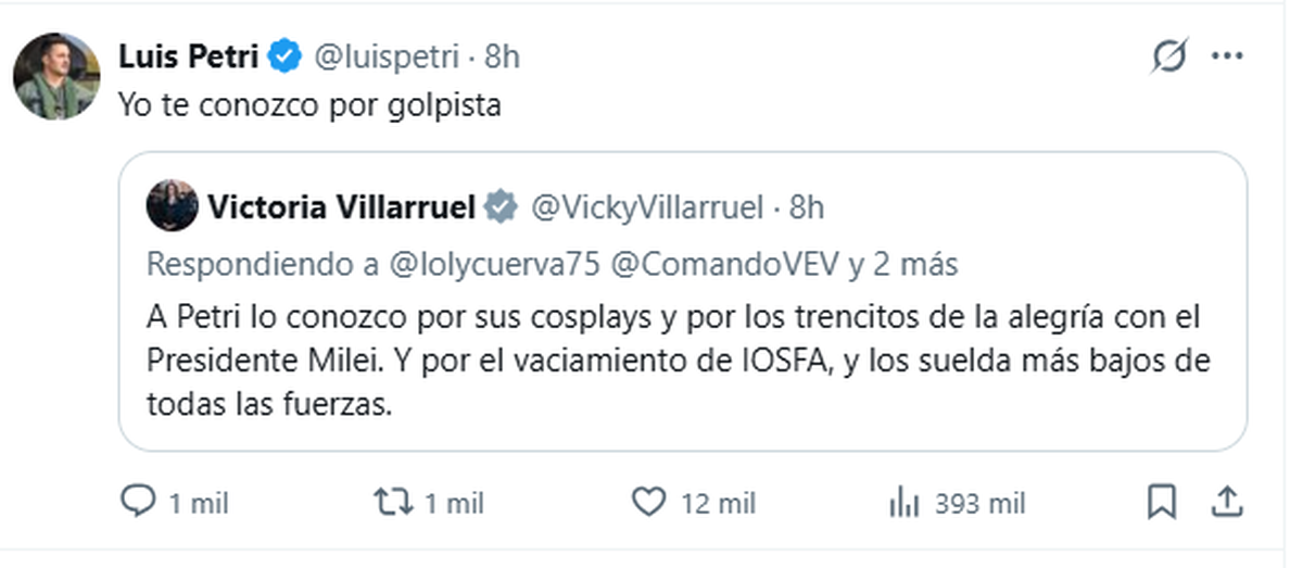 Luis Petri también contestó en X y desde su cuenta personal le escribió a la vice: “Yo te conozco por golpista”. Pero no contestó sobre las acusaciones de Villarruel sobre los salarios militares ni el caso de IOSFA.