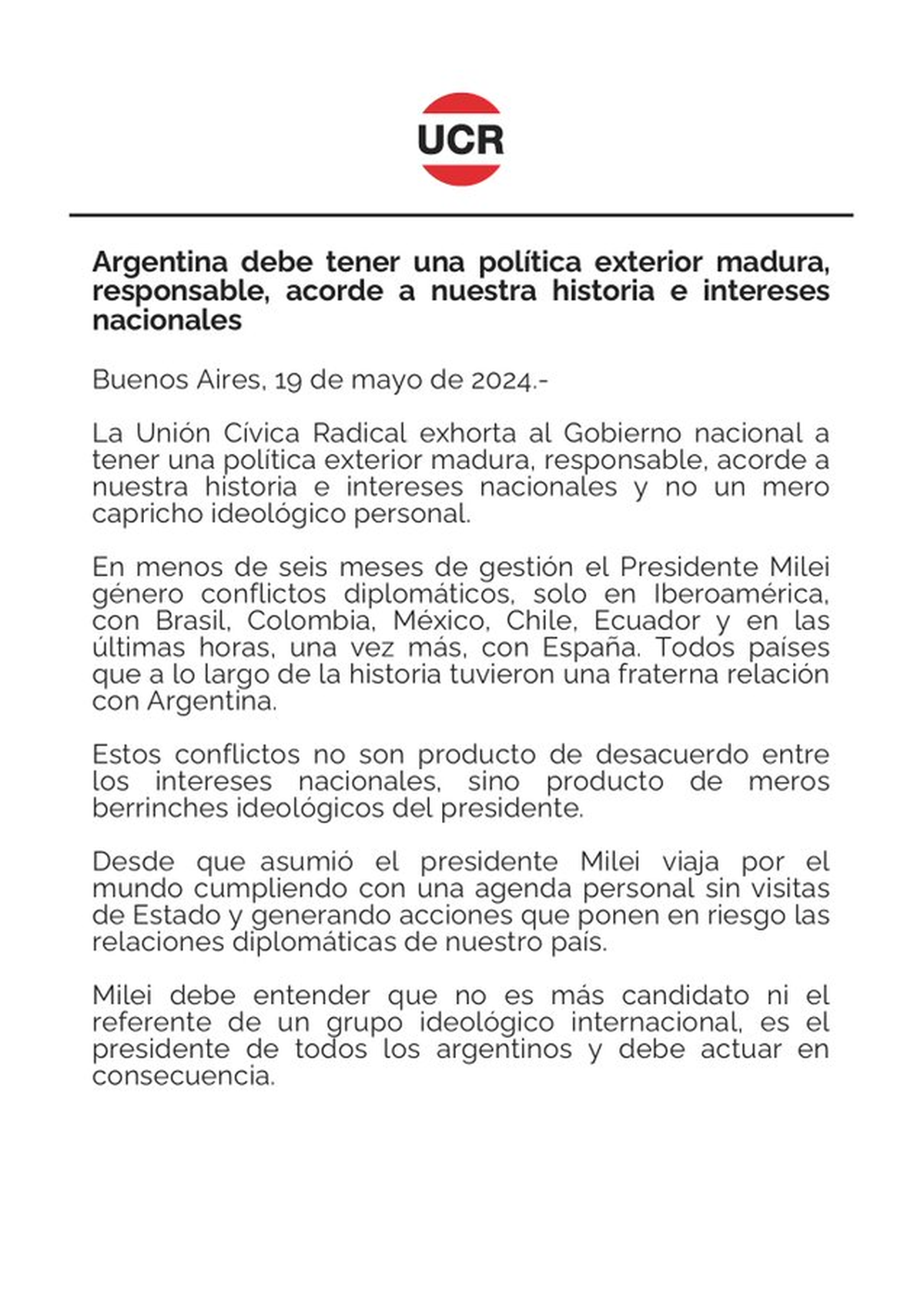 "En sólo 5 meses el presidente Milei ha generado contantes crisis diplomáticas por su sesgo ideológico, por su fanatismo intolerante a unos ideales, incurriendo en repetidad descalificaciones a otros mandatarios que piensan distinto y comprometiendo así las relaciones diplomáticas con países como China, Estados Unidos, Brasil, Chile, México, Colombia, Ecuador y España", dice un comunicado del interbloque que integran excambiemitas como Pichetto, Emilio Monzó, Nicolás Massot, además de los legisladores cordobesista, Margarita Stolbizer y Ricardo López Murphy, entre otros.