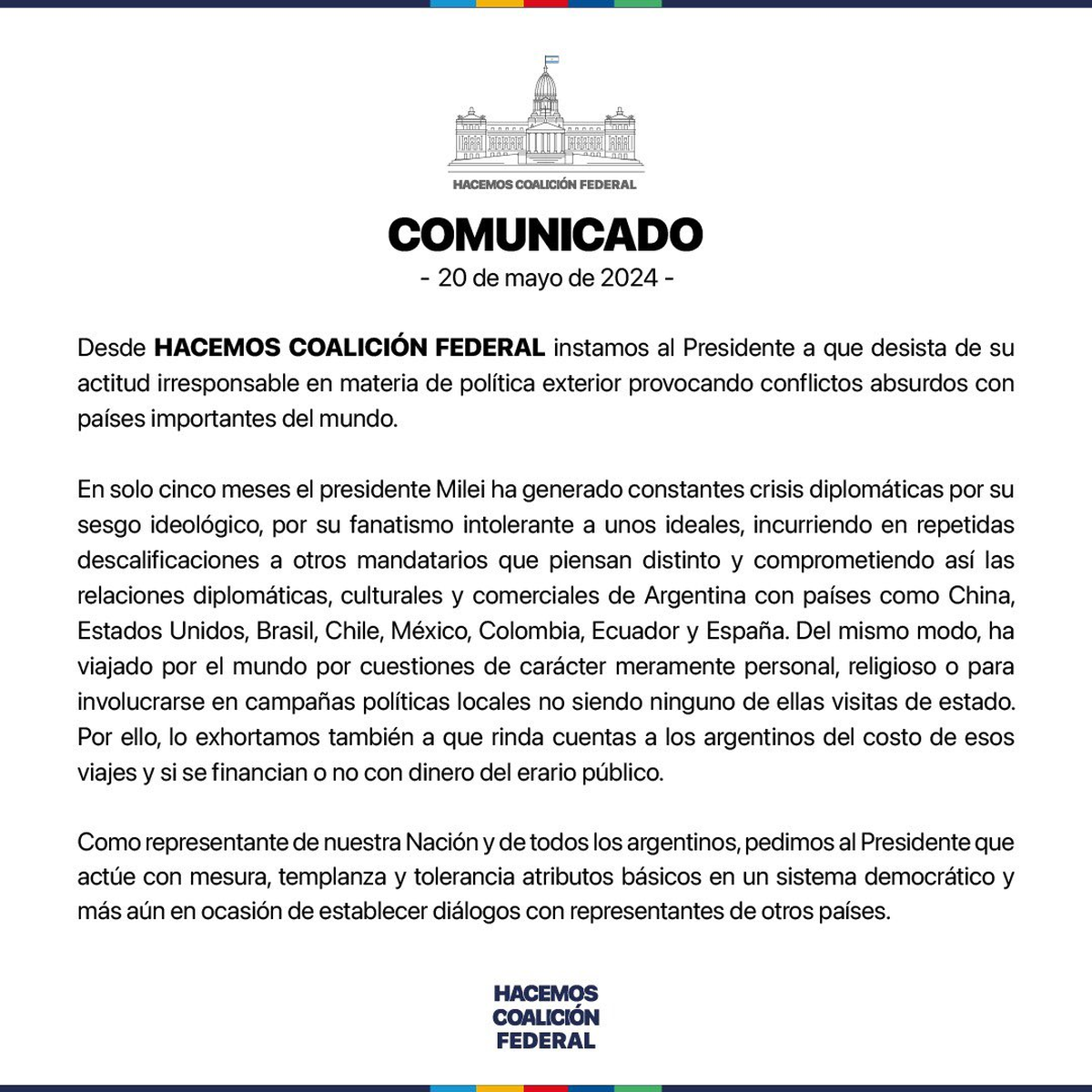 "Como representante de nuestra Nación y de todos los argentinos, pedimos al presidente que actúe con mesura, templanza y tolerancia a atributos básciso en un sistema democrático y más aún en ocasión de establecer diálogos con los representantes de otros países.