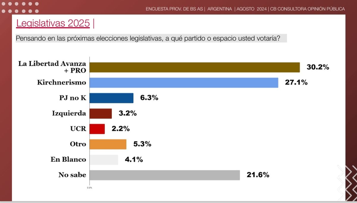 En la encuesta de CB, la alianza LLA-PRO lidera la intención de voto en ese escenario alternativo con el 30,3%, relegando al kirchnerismo al 2do puesto, con el 27,1%, aunque por el margen de error del sondeo (+/-2,8%) el resultado entra en la zona de empate técnico. En esta hipótesis los indecisos siguen superando el 20%.
