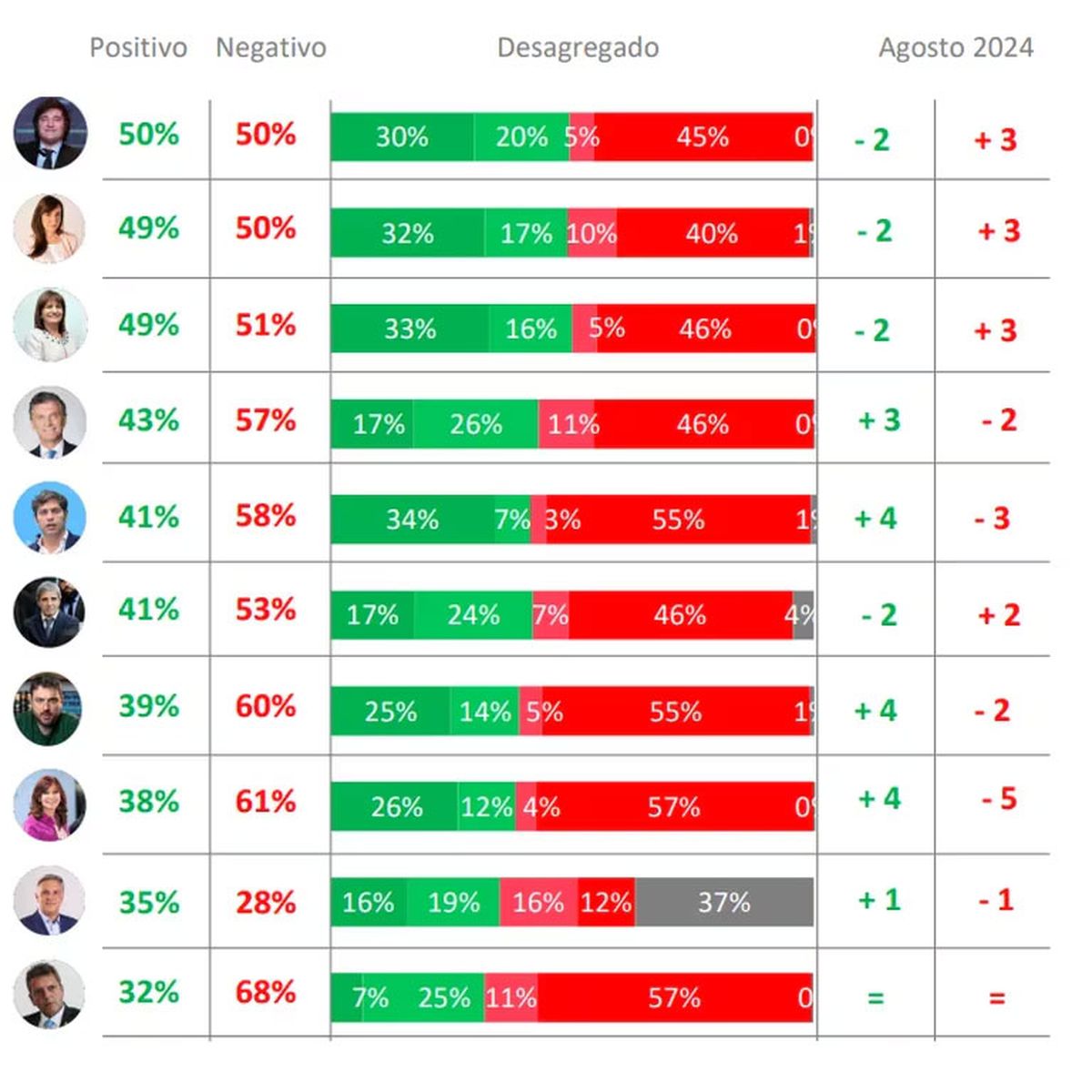 De acuerdo a la encuesta de Opina Argentina, relevada de forma online a nivel nacional, Milei encabeza el cuadro de imagen positiva con el 50% mientras que el mismo guarismo se repite en la imagen negativa. Respecto de la medición de agosto, la aprobación del Presidente se contrajo 2 puntos porcentuales, mientras que la desaprobación creció 3 puntos.