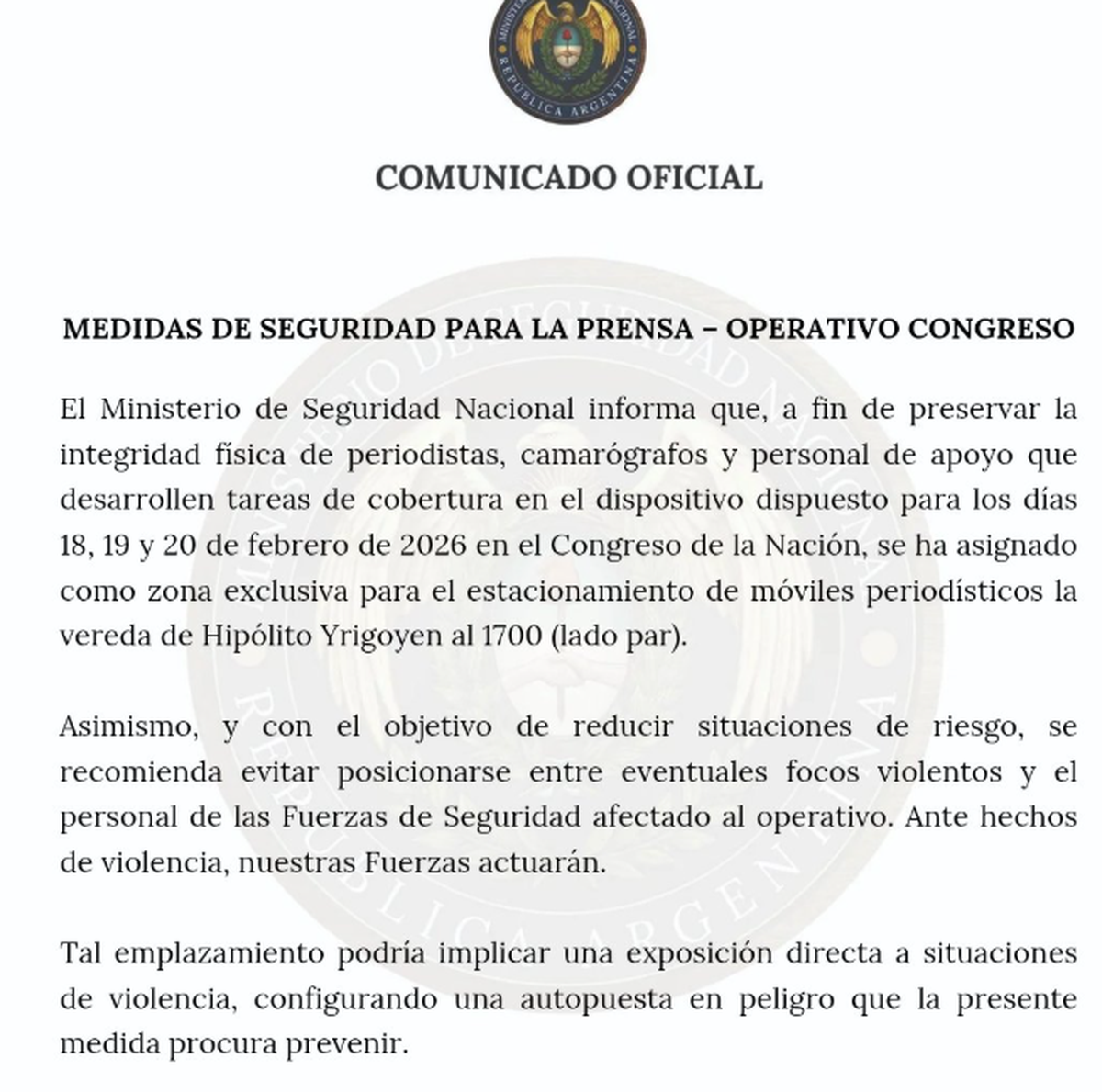 El Gobierno nacional, a través del ministerio de Seguridad, emitió este martes (17/02) un curioso comunicado dirigido a los periodistas que cubran las manifestaciones contra la reforma laboral, en el que admite que su seguridad no está garantizada y desliga responsabilidades. Traerá cola...