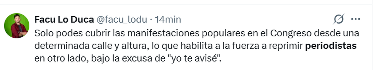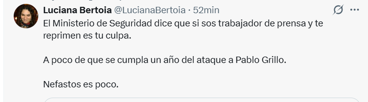 Con el antecedente del fotógrafo Pablo Grillo ya quedó demostrado que la seguridad no está garantizada. Pero este comunicado, de todos modos, no exculparía, en principio, de responsabilidades legales o judiciales hacia los efectivos que hieran a algún trabajador de prensa (de hecho, el gendarme Héctor Guerrero fue procesado por las lesiones gravísimas provocadas a Grillo) o incluso hacia sus superiores, como ser una ministra.